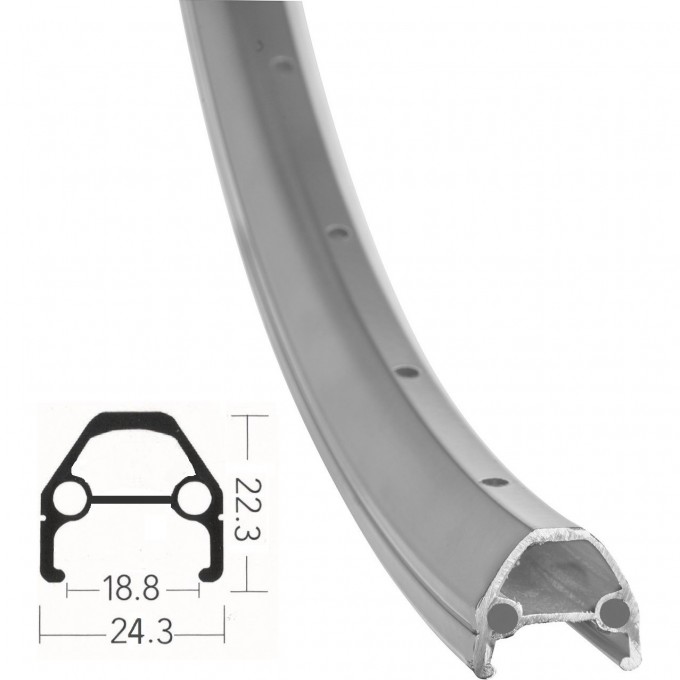 Обод 24" ЖВМЗ на 36 спиц 14G, двойной профиль 22,30х24,30 мм, внутренняя ширина 18,80 мм, фрезерованные боковины, алюминиевый, серебристый